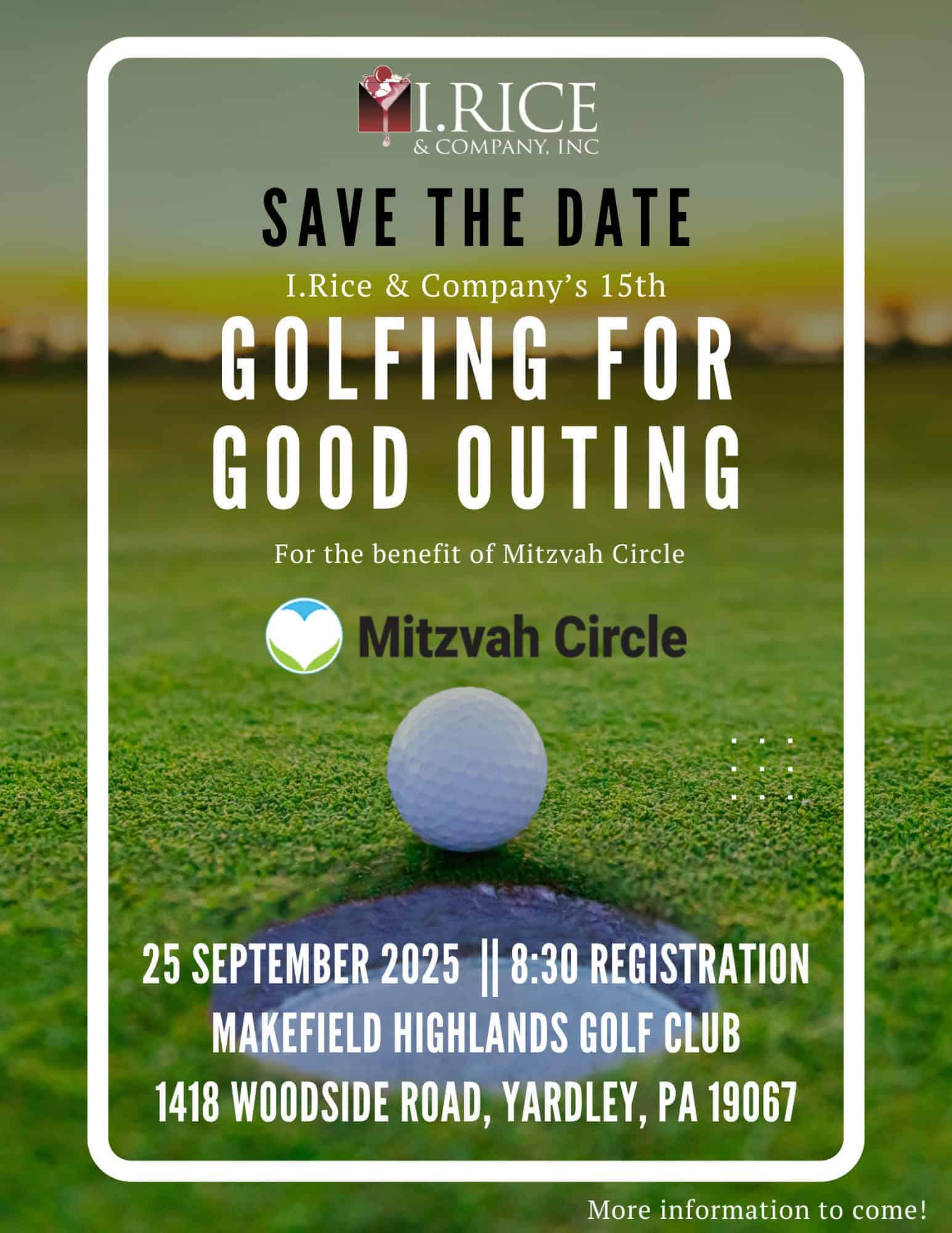 In collaboration with Mitzvah Circle, I. Rice and Company is hosting a charity golf outing at Makefield Highlands Country Club in Yardley, PA. Our 15th golf outing will take place on September 25, 2025 and all proceeds will be benefitting Mitzvah Circle.